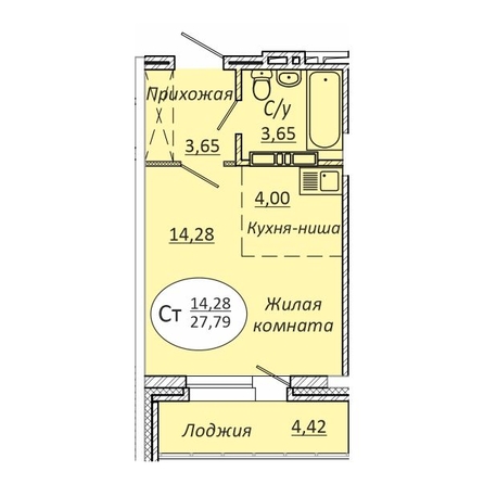 Общая площадь квартиры — 27.79 кв.м. Тип дома — монолит-кирпич. Компания-застройщик — БизнесСтрой.