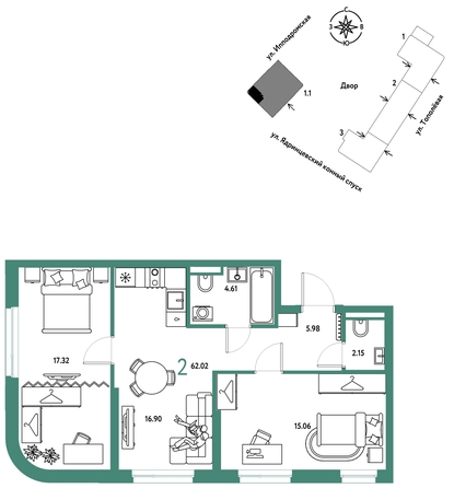 Продается 2–комнатная квартира на 18 этаже от застройщика “Страна Девелопмент”. Площадь квартиры 62,02 кв. м.