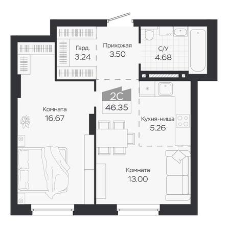 Общая площадь квартиры — 46.35 кв.м. Тип дома — монолит-кирпич. Компания-застройщик — ГРУППА МЕТА.