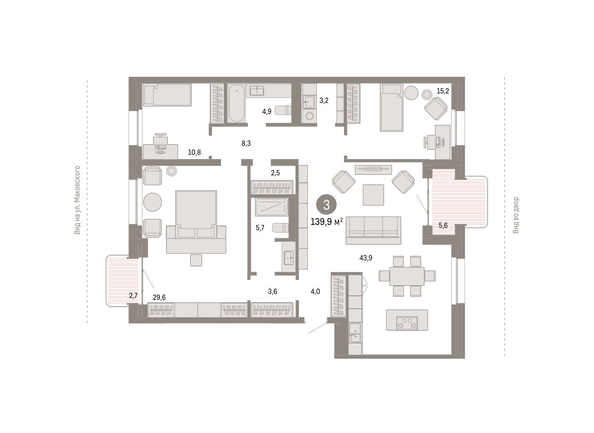 Квартира с кухней-гостиной и тремя спальнями в квартале «На Декабристов». Особенности планировки: гардеробная, лоджия, разнесённые спальни, предчистовая отделка, постирочная, балкон.