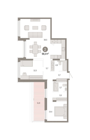 Квартира с кухней-гостиной и двумя спальнями в микрорайоне «Европейский берег». Особенности планировки: второй санузел, гардеробная, предчистовая отделка, терраса на крыше.