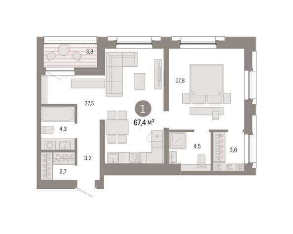 Квартира с кухней-гостиной и одной спальней в микрорайоне «Европейский берег». Особенности планировки: второй санузел, гардеробная, лоджия, предчистовая отделка, мастер-спальня.