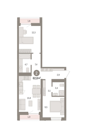 Квартира с кухней-гостиной и двумя спальнями в квартале Авиатор. Особенности планировки: гардеробная, вид во двор, лоджия, разнесённые спальни, предчистовая отделка, мастер-спальня.