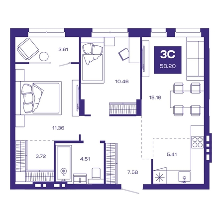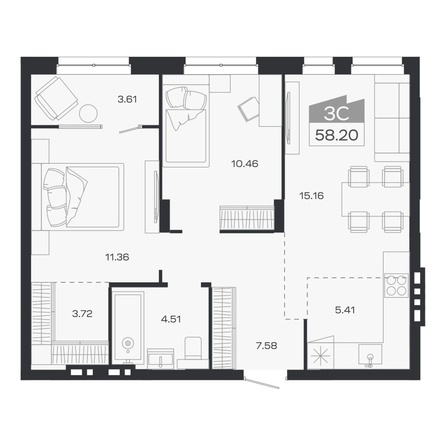 Общая площадь квартиры — 58.2 кв.м. Тип дома — монолит-кирпич. Компания-застройщик — Группа МЕТА.