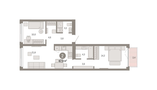 Квартира с кухней-гостиной и двумя спальнями в микрорайоне «Европейский берег». Особенности планировки: окна на две стороны, гардеробная, вид во двор, разнесённые спальни, предчистовая отделка, мастер-спальня, балкон.
