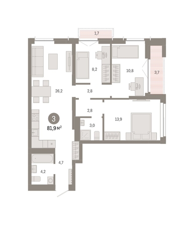 Квартира с кухней-гостиной и тремя спальнями в микрорайоне «Европейский берег». Особенности планировки: гардеробная, окна в пол, лоджия, предчистовая отделка, мастер-спальня, балкон.