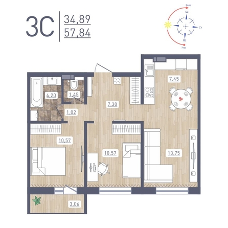 Продам 3-комнатную 57.84 кв.м. 7/17 этаж, монолит-кирпич, Новосибирск, Забалуева ул, 69.