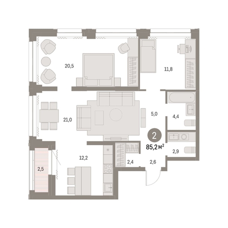 Квартира с кухней-гостиной и двумя спальнями в квартале «Мылзавод». Особенности планировки: второй санузел, гардеробная, лоджия, предчистовая отделка.