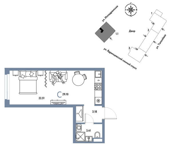 Продается 1–комнатная квартира на 20 этаже от застройщика “Страна Девелопмент”. Площадь квартиры 29,1 кв. м.