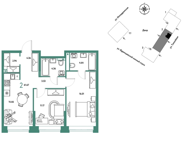 Продается 2–комнатная квартира на 2 этаже от застройщика “Страна Девелопмент”. Площадь квартиры 61,67 кв. м.
