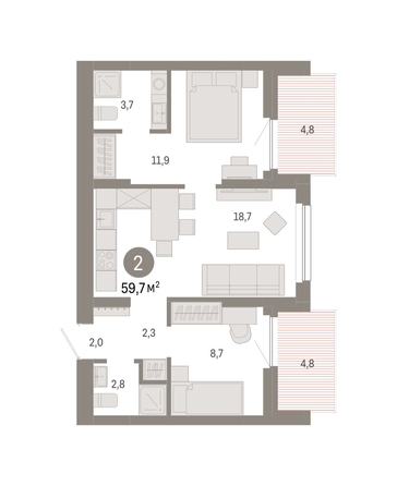 Квартира с кухней-гостиной и двумя спальнями в квартале «Лебедевский». Особенности планировки: разнесённые спальни, предчистовая отделка, мастер-спальня, балкон.