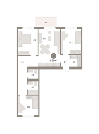 Квартира с кухней-гостиной и тремя спальнями в жилом районе «Пшеница». Особенности планировки: окна на две стороны, гардеробная, вид во двор, разнесённые спальни, предчистовая отделка, мастер-спальня, балкон.