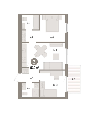Квартира с кухней-гостиной и двумя спальнями в жилом районе «Пшеница». Особенности планировки: гардеробная, вид во двор, разнесённые спальни, предчистовая отделка, мастер-спальня, балкон.