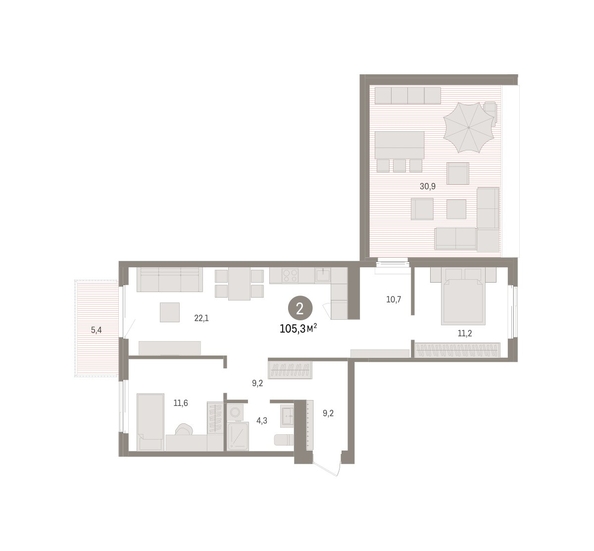Квартира с кухней-гостиной и двумя спальнями в жилом районе «Пшеница». Особенности планировки: окна на две стороны, вид во двор, разнесённые спальни, предчистовая отделка, балкон, терраса на крыше.