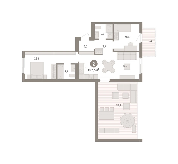 Квартира с кухней-гостиной и двумя спальнями в жилом районе «Пшеница». Особенности планировки: окна на две стороны, вид во двор, разнесённые спальни, предчистовая отделка, мастер-спальня, балкон, терраса на крыше.