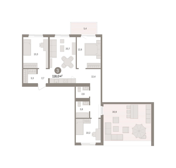 Квартира с кухней-гостиной и тремя спальнями в жилом районе «Пшеница». Особенности планировки: окна на две стороны, гардеробная, вид во двор, разнесённые спальни, предчистовая отделка, мастер-спальня, балкон, терраса на крыше.