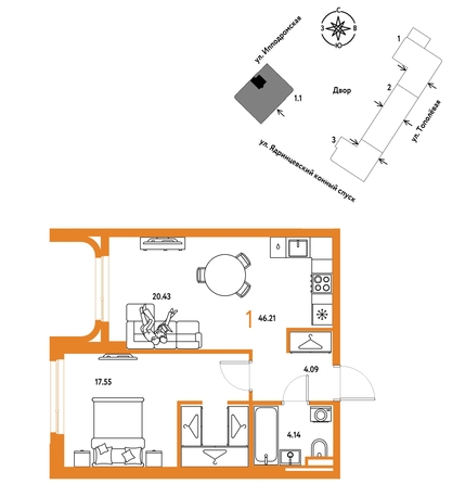 Продается 1–комнатная квартира на 7 этаже от застройщика “Страна Девелопмент”. Площадь квартиры 46,21 кв. м.