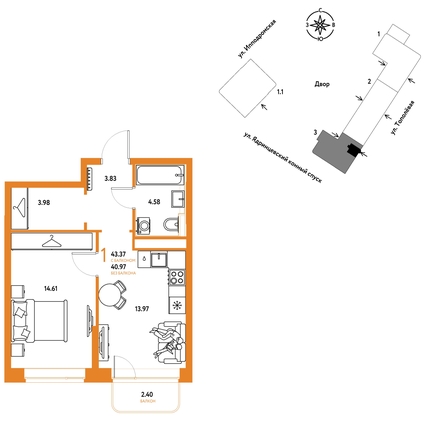 Продается 1–комнатная квартира на 5 этаже от застройщика “Страна Девелопмент”. Площадь квартиры 43,37 кв. м.
