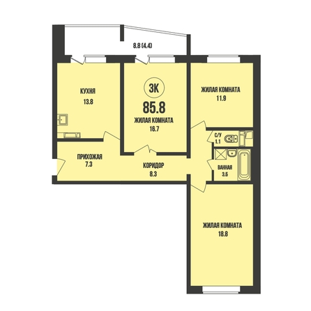 Общая площадь квартиры — 85.8 кв.м. Тип дома — панельный. Компания-застройщик — Энергомонтаж.