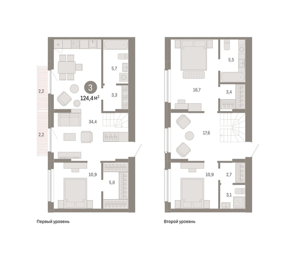 Двухуровневая квартира с кухней-гостиной и тремя спальнями в жилом районе «Пшеница». Особенности планировки: окно в коридоре, гардеробная, двухуровневая, вид во двор, свободная планировка, разнесённые спальни, мастер-спальня, балкон.
