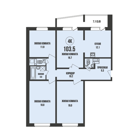 Общая площадь квартиры — 103.5 кв.м. Тип дома — панельный. Компания-застройщик — Энергомонтаж.