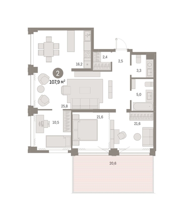 Квартира с кухней-гостиной и двумя спальнями в квартале «Мылзавод». Особенности планировки: второй санузел, гардеробная, окна в пол, предчистовая отделка, терраса на крыше.