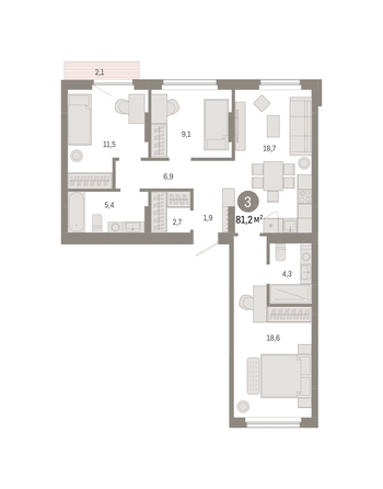 Трёхкомнатная квартира в квартале «Лебедевский» — это квартира с объединённой кухней-гостиной и тремя спальнями. Планировкой предусмотрены ниши для хранения вещей, отдельная гардеробная или шкафы в спальне, просторная ванная комната и гостевой санузел, собственная постирочная. Есть варианты квартир с тёплой лоджией, где можно разместить рабочее место, или открытой террасой.