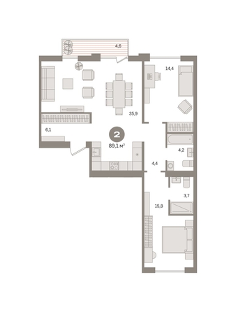 Квартира с кухней-гостиной и двумя спальнями в жилом районе «Пшеница». Особенности планировки: окна на две стороны, гардеробная, окна в пол, вид во двор, разнесённые спальни, предчистовая отделка, мастер-спальня, балкон.
