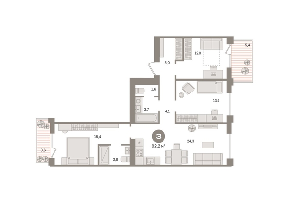 Квартира с кухней-гостиной и тремя спальнями в жилом районе «Пшеница». Особенности планировки: окна на две стороны, второй санузел, гардеробная, окна в пол, вид во двор, разнесённые спальни, предчистовая отделка, мастер-спальня, балкон.