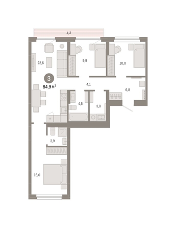 Квартира с кухней-гостиной и тремя спальнями в квартале «Лебедевский». Особенности планировки: окна на две стороны, разнесённые спальни, предчистовая отделка, мастер-спальня, постирочная, балкон.