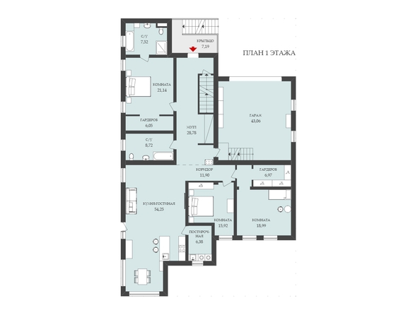В цоколе — санузел, три помещения свободного назначения (игровая, спортзал, мастерская, кинотеатр) и техзона: газовый котёл, тёплые полы, система фильтрации, накопительный бак — всё аккуратно собрано в одном помещении.