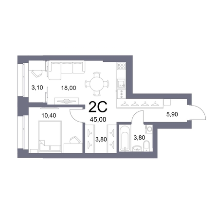 Общая площадь квартиры — 45 кв.м. Тип дома — монолит-кирпич. Компания-застройщик — Дом-Строй.