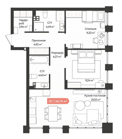 На -1 этаже — парковка, колясочная-велосипедная и кладовые. Это позволяет сэкономить пространство в квартире и хранить некоторые вещи там.