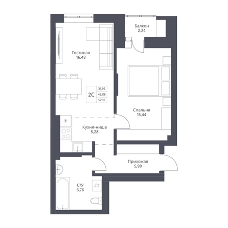 Продается 2-комн. студия с отделкой White box. Квартира расположена на 2 этаже 24 этажного монолитно-кирпичного дома в Акцентном доме «Актив» от группы компаний «Поляков».