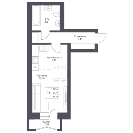 Продается 1-комн. студия с отделкой White box. Квартира расположена на 2 этаже 24 этажного монолитно-кирпичного дома в Акцентном доме «Актив» от группы компаний «Поляков».