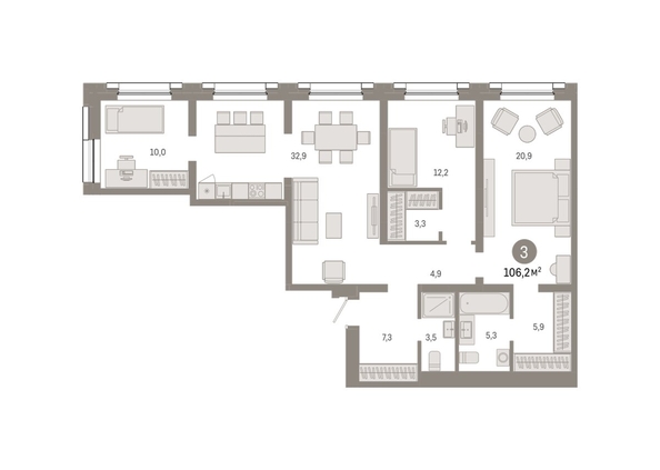 Квартира с кухней-гостиной и тремя спальнями в микрорайоне «Европейский берег». Особенности планировки: гардеробная, разнесённые спальни, предчистовая отделка, мастер-спальня.