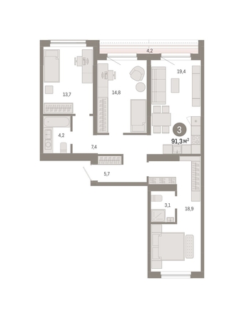 Квартира с кухней-гостиной и тремя спальнями в микрорайоне «Европейский берег». Особенности планировки: окна на две стороны, вид во двор, лоджия, разнесённые спальни, предчистовая отделка, мастер-спальня.