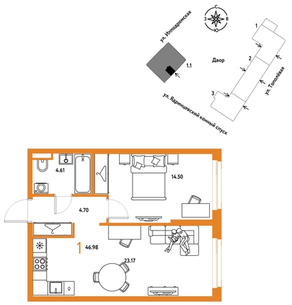 Продается 1–комнатная квартира на 28 этаже от застройщика “Страна Девелопмент”. Площадь квартиры 46,98 кв. м.