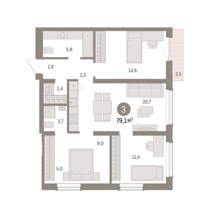 Квартира с кухней-гостиной и тремя спальнями в квартале Авиатор. Особенности планировки: гардеробная, вид во двор, разнесённые спальни, предчистовая отделка, мастер-спальня, балкон.