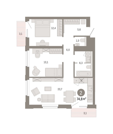 Квартира с кухней-гостиной и двумя спальнями в проекте Город-на-озере. Особенности планировки: балкон, второй санузел, потолки 3 м и выше, предчистовая отделка, разнесённые спальни.