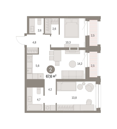 Квартира с кухней-гостиной и двумя спальнями в квартале «Мылзавод». Особенности планировки: второй санузел, гардеробная, вид во двор, лоджия, предчистовая отделка.