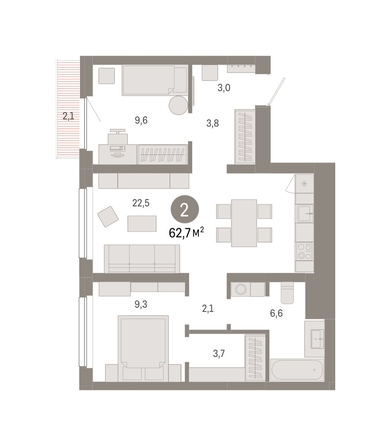 Двухкомнатная квартира в квартале «Лебедевский» — это квартира с объединённой кухней-гостиной и двумя спальнями. Планировкой предусмотрены ниши для хранения вещей, отдельная гардеробная или шкафы в спальне, просторная ванная комната и гостевой санузел, собственная постирочная. Есть варианты квартир с тёплой лоджией, где можно разместить рабочее место, или открытой террасой.