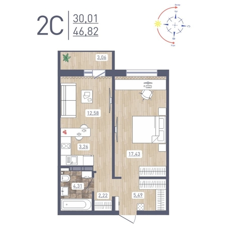 Продам 2-комнатную 46.82 кв.м. 11/17 этаж, монолит-кирпич, Новосибирск, Забалуева ул, 69.